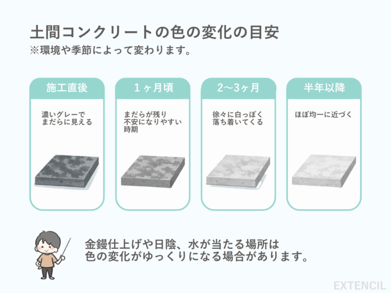 つまり、丁寧にきれいに仕上げた土間ほど、見た目の色が落ち着くまで時間がかかることもあるのです。