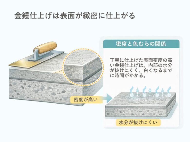 金鏝仕上げは表面を丁寧に押さえて緻密に仕上げるため、表面の密度が高くなり、水分が抜けにくくなる傾向があります。